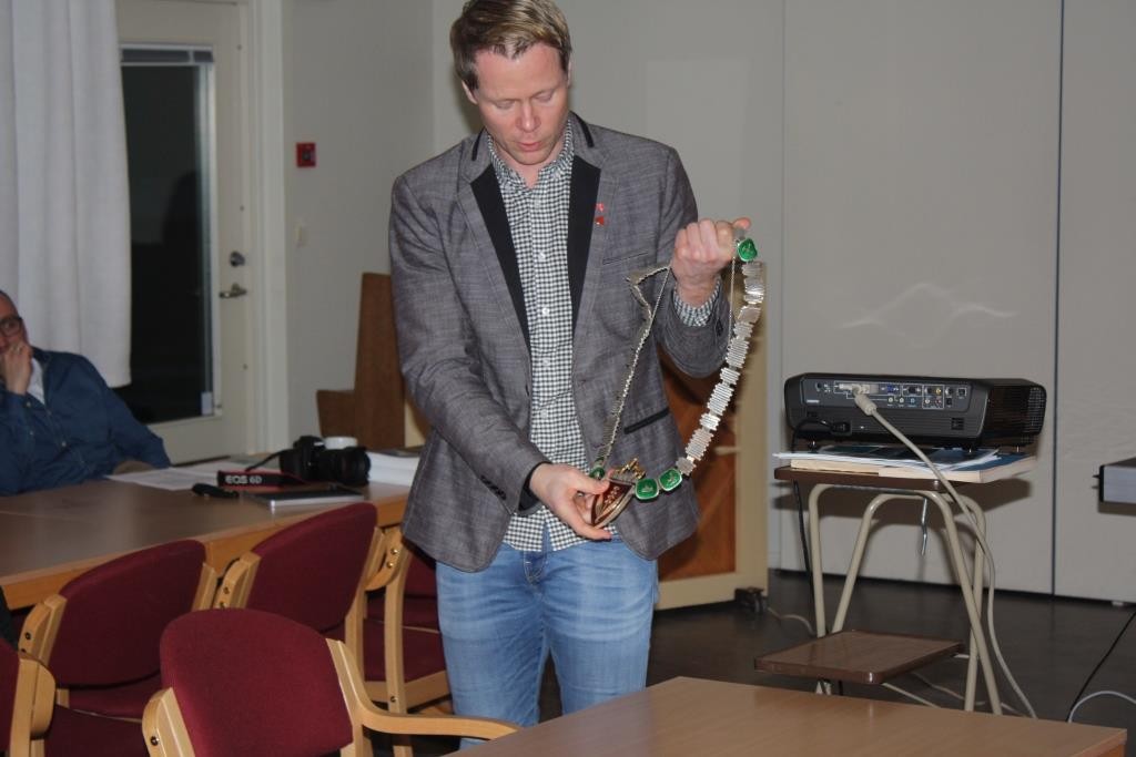 Ordføreren forklarer symbolikken i ordførerkjedet, og rådmannen forteller om kommunens organisasjon (Under)